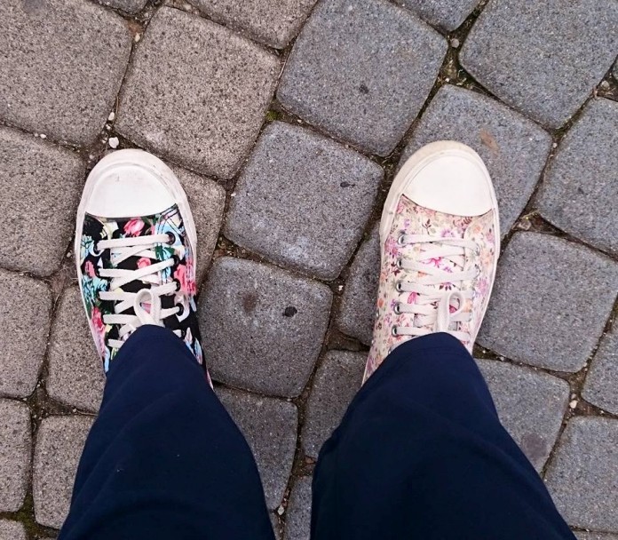 Je pa tako, da se ljudje odločajo za različne izvedbe. Lahko je nošenje dveh različnih čevljev tako prijetna in enostavna, kot je bila moja – dva ista modela v različnih barvah – ali pa grozna, kot je, če se odločite, da boste 3. maja (ali še kdaj) obuli na eno nogo škorenj, na drugo pa natikač. Kakorkoli se boste odločiti, to narediti s ponosom! 🙂